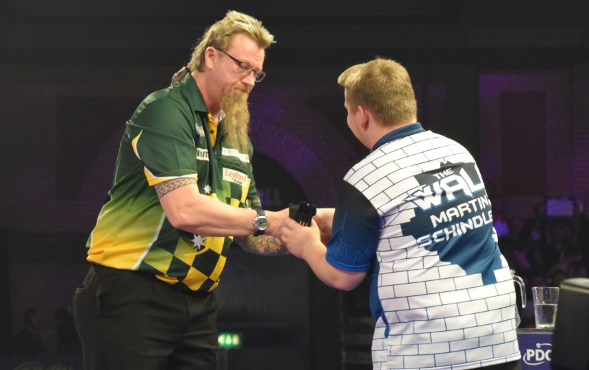 Martin Schindler hat den nächsten deutschen Coup verpasst. Der Deutsche musste sich gegen Simon Whitlock mit 1:3 geschlagen geben und scheiterte vor allem an einer schwachen Doppelquote. Die ersten drei Legs wurden noch gerecht aufgeteilt, im vierten Leg verpasste Schindler fünf Darts zum 2:2-Ausgleich und Whitlock staubte den ersten Satz auf der D10 ab. In 13 Darts ging das erste Leg des zweiten Satzes an den Deutschen, Whitlock hielt mit einem 11-Darter dagegen. Auf der D10 ging Schindler wieder in Führung, nach drei verpassten Setdarts auf der D12 brachte „The Wizard“ den zweiten Satz auf der D9 in den Decider, den Schindler mit einem 14-Darter für sich entscheiden konnte. Ein von beiden Spielern sehr schwaches erstes Leg des dritten Satzes ging in 28 Darts auf der D1 an „The Wall“, der vier Darts zum 2:0 verpasste und Whitlock somit auf der D1 das Re-Break fand. Nachdem die folgenden beiden Legs mit den Darts gingen, musste auch dieser Durchgang im Decider entschieden werden. Zunächst verpasste Whitlock einen Satzdart auf Tops, doch auch Schindler konnte den letzten Dart nicht im Bullseye unterbringen, so dass der Australier auf der D10 diesen Satz gewann. Danach ging beim jungen Deutschen nicht mehr viel. In 14 Darts breakte der diesjährige World Grand Prix Finalist und erhöhte auf der D4 auf 2:0. Mit einem 127er-Bullfinish zum Matchgewinn ließ der Australier dann am Ende nochmal seine Klasse aufblitzen. Mehr war drin für Schindler, dem die schwache Doppelquote zum Verhängnis wurde. Im dritten Satz hatte er Whitlock in einer guten Position, konnte das Match aber in dieser Phase nicht entscheidend an sich reißen. Trotzdem sollte der Strausberger das Positive aus seinem starken ersten PDC-Jahr mitnehmen und im nächsten Jahr wieder voll angreifen.