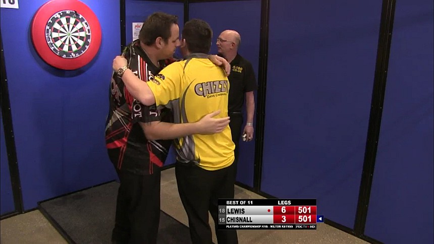 Adrian Lewis knüpfte im ersten Leg des Finals direkt da an, wo er zuvor gegen Michael van Gerwen aufgehört hatte und holte sich in 11 Darts die 1:0-Führung und legte direkt ein 164er-Finish zum 2:0 nach. Bei eigenem Anwurf zog der Weltmeister von 2011 und 2012 sogar auf 3:0 davon und verpasste gar drei Darts zum 4:0, so dass Chisnall zum ersten Mal aufs Scoreboard kam. Lewis verpasste in Leg Nr.5 zwar das 170er-Finish, hielt in 14 Darts aber trotzdem mühelos seinen Aufschlag, mit einem 112er-Checkout stellte Chisnall den alten Abstand aber wieder her. Gegen die Darts ließ Lewis aber nichts zu und war nach einem 71er-CO nur noch ein Leg vom Matchgewinn entfernt. Chisnall kam nochmal auf 3:5 heran und dann versenkte Lewis fast den 9-Darter zum Turniergewinn, doch der Versuch auf die D12 landete im Single-Feld. Doch dies tat nichts zur Sache, im Nachsetzen holte sich „Jackpot“ auf der D1 dann den völlig verdienten 6:3-Sieg, sein erster Erfolg nach dem Gewinn das World Cup of Darts im Juni 2016 zusammen mit Phil Taylor und seinem letzten Sieg auf der Pro-Tour seit Februar 2016. Im anschließenden Interview zeigte sich Lewis sichtlich erleichtert, nachdem seine Frau lange im Krankenhaus war und er nur wenig bis kaum trainieren konnte. Vielleicht ein Sieg, der für Lewis in den nächsten Wochen noch richtungsweisend werden kann.