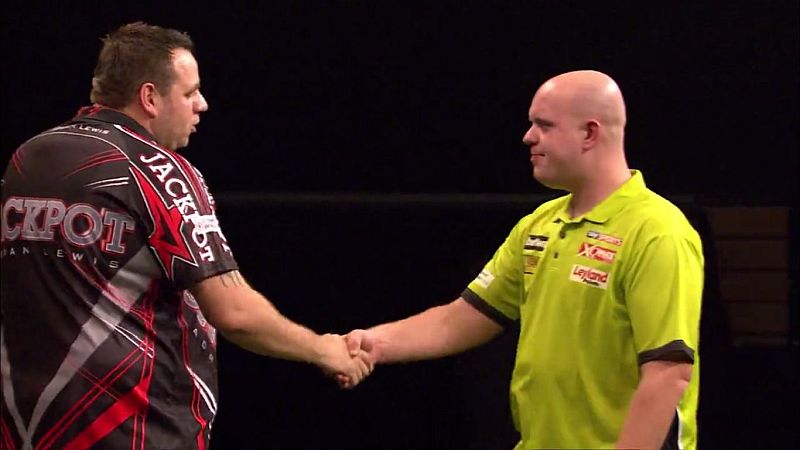 Der Titelverteidiger und amtierende Weltmeister startete schwungvoll mit einem 11-Darter, verpasste jedoch im Anschluss vier Breakchancen und kassierte den Ausgleich. Danach spielte Lewis zwei 13-Darter, bevor ihn van Gerwen mit einem 116er Finish stoppte. „Jackpot“ reagierte angemessen mit einem fantastischen 170er Finish, ehe der Gegner in 11 Darts wieder verkürzte. Ein 15-Darter ließ van Gerwen zum 4:4 zurückbreaken, doch Lewis holte sich mit derselben Zahl an Pfeilen die Führung wieder zurück. Die Nummer Eins der Welt war in 13 und 14 Darts zur Stelle und lag damit zum zweiten Mal in der Partie vorne. Lewis raffte sich jedoch in einem nervösen letzten Leg noch einmal auf und machte das Unentschieden perfekt. Van Gerwen verpasste zuvor das Bullseye, um 170 für den Sieg auf null zu bringen.