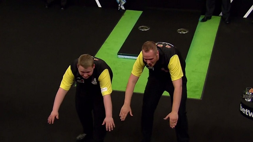 Für die Fans in Frankfurt war es das Highlight der ersten Runde, das Spiel der Deutschen Max Hopp und Martin Schindler gegen die Nordiren Daryl Gurney und Brendan Dolan. Die deutsche Paarung kam leicht besser in die Partie und holte sich das erste Leg auf der D8. Im zweiten Leg war man drauf und dran direkt das erste Break einzufahren, doch Hopp überwarf 97 Punkte und Schindler konnte die Punktzahl im zweiten Versuch ebenfalls nicht checken, Gurney bedankte sich auf der D12 zum 1:1. In Leg drei liefen die Spieler so langsam warm, erst warf Dolan die 180, doch Hopp konterte ebenfalls mit der maximalen Aufgabe, um Schindler die D10 zu lassen, doch Gurney checkte 124 Punkte auf der D11. Die jungen Deutschen ließen sich davon allerdings nicht beeindrucken und holten sich postwendend das Re-Break auf der D20, mussten aber im Gegenzug erneut ihren Anwurf abgeben. Im sechsten Leg stellten sich die Nordiren auf 40 Punkte und der ehemalige Jugendweltmeister Hopp checkte 123 Punkte auf der D9, brutal wichtig in dieser Situation. Vier verpasste Doppel im nächsten Leg gaben den Nordiren die Möglichkeit, das Match bei eigenem Anwurf nach Hause zu bringen, doch Schindler brachte das Spiel auf der D16 in den Decider. Diesen begann Hopp mit einer 140, Gurney antwortete mit einer 123. Nach zwölf Darts standen noch 72 Punkte bei Deutschland auf der Uhr, doch Hopp verpasste den ersten Matchdart auf der D20. Somit hatte Gurney die Chance, das Spiel zu beenden, doch auch sein Matchdart verpasste die D12 nur knapp. So kam „The Wall“ Martin Schindler zurück ans Board und checkte mit dem letzten Dart in der Hand auf der D10 zum umjubelten Sieg.
